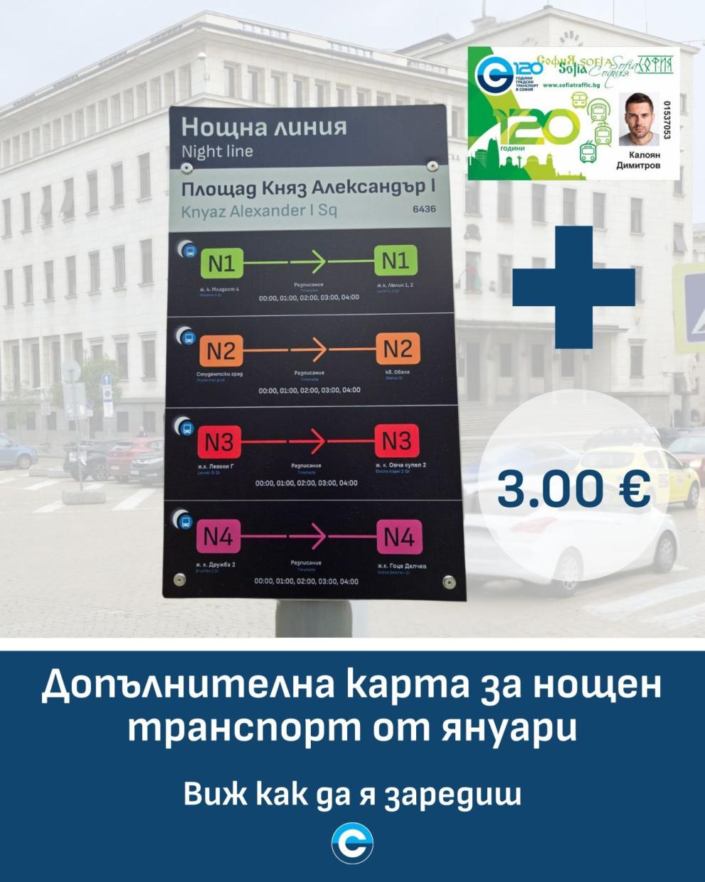 Пътниците с дълготрайни абонаменти за публичния превоз към този момент ще могат да прибавят към тях спомагателна карта за всички нощни линии - N1, N2, N3 и N4.