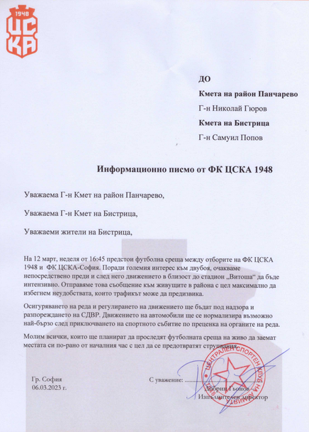 От ЦСКА 1948 изпратиха осведомително писмо до кмета на регион Панчарево, кмета на Бистрица и жителите на Бистрица. В него от клуба предизвестяват, че в неделя, когато е дуелът с ЦСКА - София, се чака придвижването към стадион " Витоша " да бъде интенвизно.