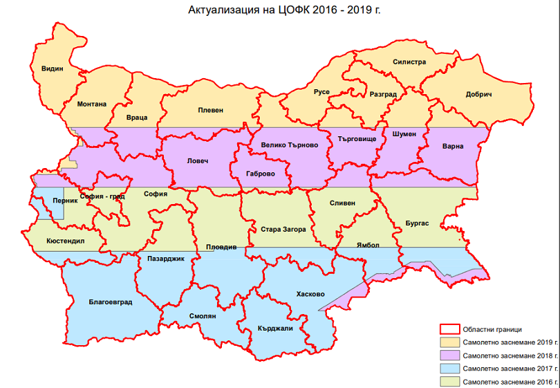 Обновяването на ЦОФК стартира през 2016 година и се реализира в границите на интервал от четири години, като годишно се снима по към една четвърт от територията. До момента самолетно снимане е осъществено над 16 области от страната.