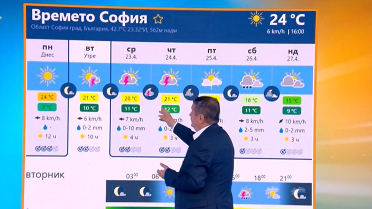 От през вчерашния ден има превалявания, през вчерашния ден имаше и гръмотевична активност в Западните Родопи, в Рила, през днешния ден следобяд ще вали също. Утре - малко повече, в четвъртък - още малко, в петък – по-малко, в събота още веднъж, в неделя - даже захлаждане. Ще имаме доста хубаво, шарено пролетно време, само че и с доста слънце. Това съобщи пред БТВ климатологът проф. Георги Рачев.
