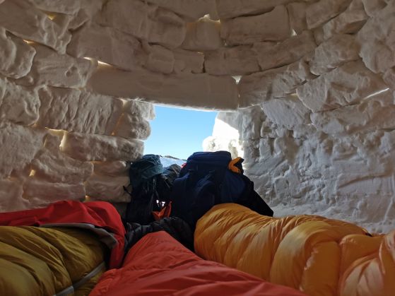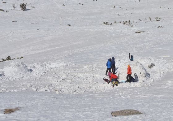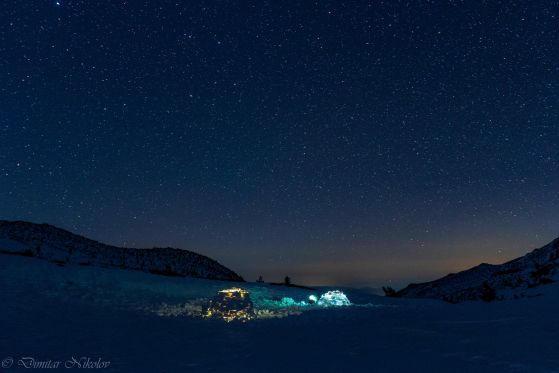 Грабнахме лопатите. Първо отстранихме рехавия пласт сняг, с цел да стигнем до твърдия, подобаващ за блокчета. В непосредственост до строителното леке на иглуто Симона и Александър оформиха „ кариера “ за добива им. Освен мускули напрегнахме и логическото мислене. Иглуто е хемисфера. Да се построи без кофраж сводестата му форма си е предизвикателство. Иска се пространствено мислене. Усет за геометрия. Наклонът на стените би трябвало да се реши по този начин, че да води във връхна точка на тавана, в която снежните блокчета към момента може да се редят без стълба - единствено с височината на личното тяло. Вкопахме основите и започнахме да зидаме. Всеки се стремеше да е оптимално потребен. Неусетно горният свят ни сплоти. Заличи егоизмите - това, в което долу непрекъснато се спъваме. Бързо осъзнахме обща неизбежност. От нея произтече неизбежна взаимност. Колкото неизбежна, толкоз и приятна. Приятно е да знаеш, че другият ти е поддръжка. Или дружно ще построим иглуто - и то в точния момент, или с рухване на нощта дружно оставаме без покрив. А зимната планина не е изключително милостива. През нощта се чакаха температури от -5 / -6оС. По-добре да построим топлото иглу…