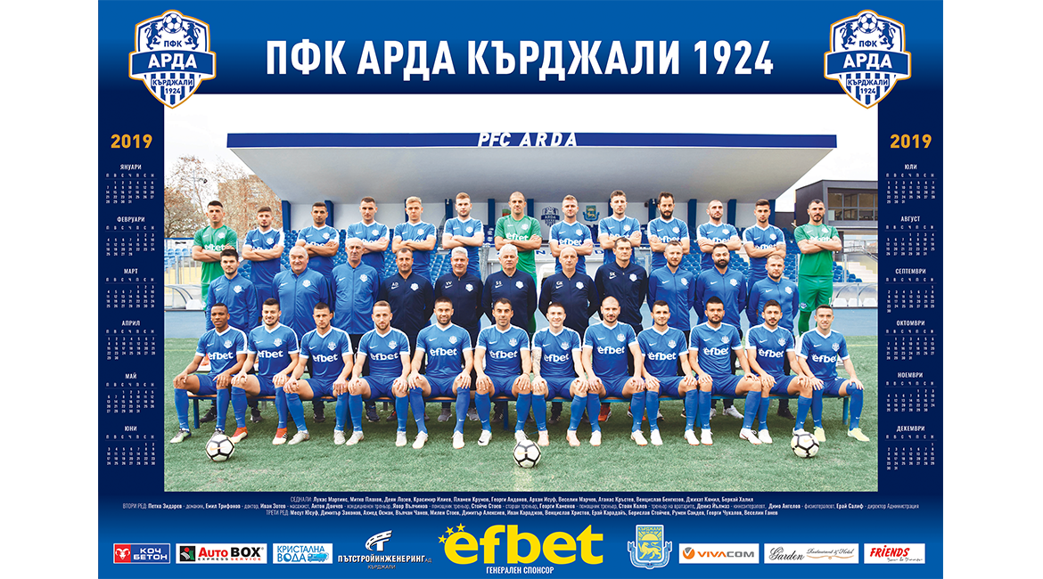 Отборът на Арда (Кърджали) към този момент има календар за новата 2019-а година. Той е еднолистов, а оповестената цена за него е два лв.. Фотосесията се организира на " Арена Арда " в Кърджали и в нея взеха присъединяване всички футболисти и целият треньорски щаб. Продажбата му започва през днешния ден (1 декември) на касите пред стадиона. С календара на Арда за 2019-а година ще се продават и шалове, тениски, спортни екипи и шуби, всички с емблемата на тима. В деня на мача с Кариана (Ерден) касите отварят от 09:00 часа.