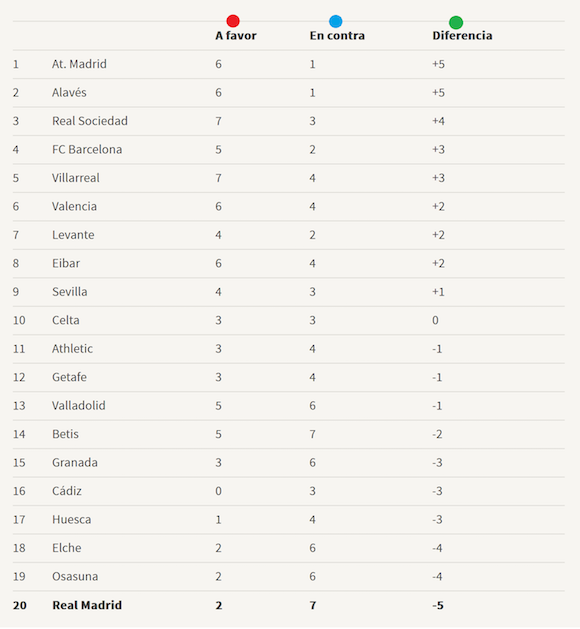 Отборът на е на последно място в забавна ранглиста по отношение на дузпите в Ла Лига този сезон. Съдиите са отсъдили цели 7 наказателни удари против първенците - 7, а в тяхна изгода са били дадени единствено 2. Няма различен клуб с такава амплитуда в тези индикатори. Срещу също са били изпълнени 7 шута от бялата точка, само че пък отборът е получил 5.