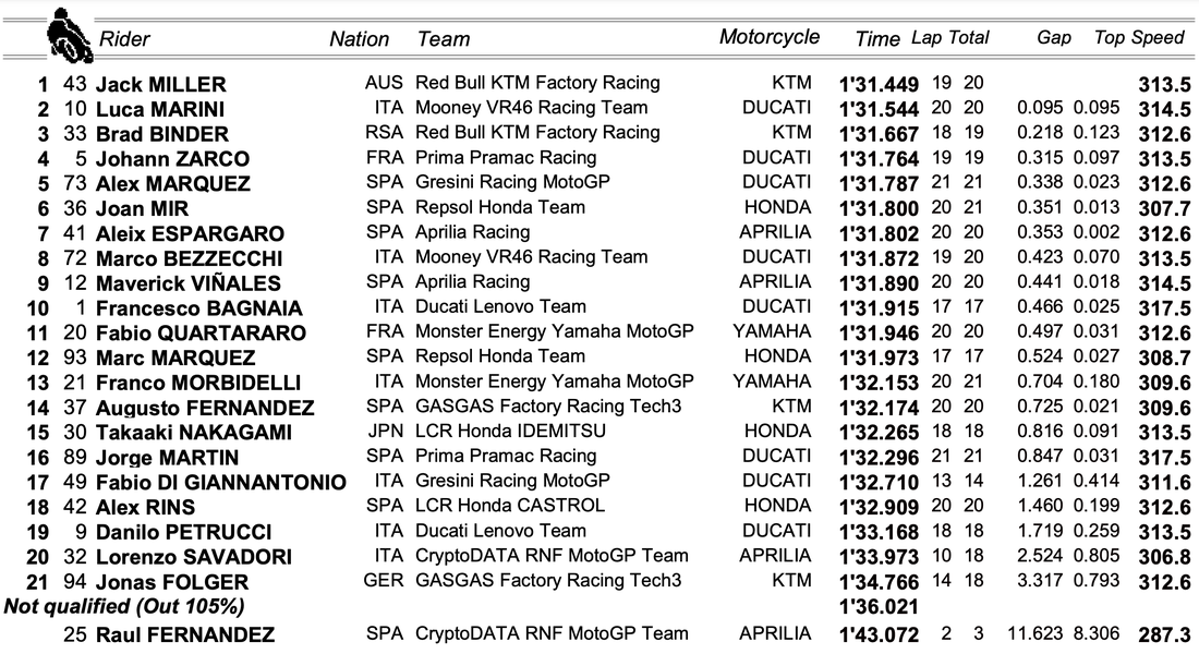 Милър оглави класирането с време от 1:31.449, което бе с 0.218 по-добро то това на Биндър. Двамата съотборници в КТМ бяха разграничени от Лука Марини (VR46 Дукати), който бе с 0.095 по-бавен от Милър.