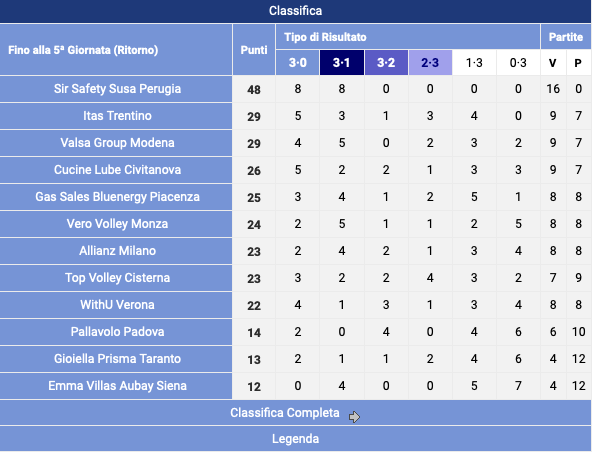 Така Перуджа към този момент им в актива си 48 точки (16 победи) и е с 19 точки пред втория във краткотрайното класиране, което е изцяло задоволително, с цел да завоюва постоянния сезон - 6 кръга преди края.