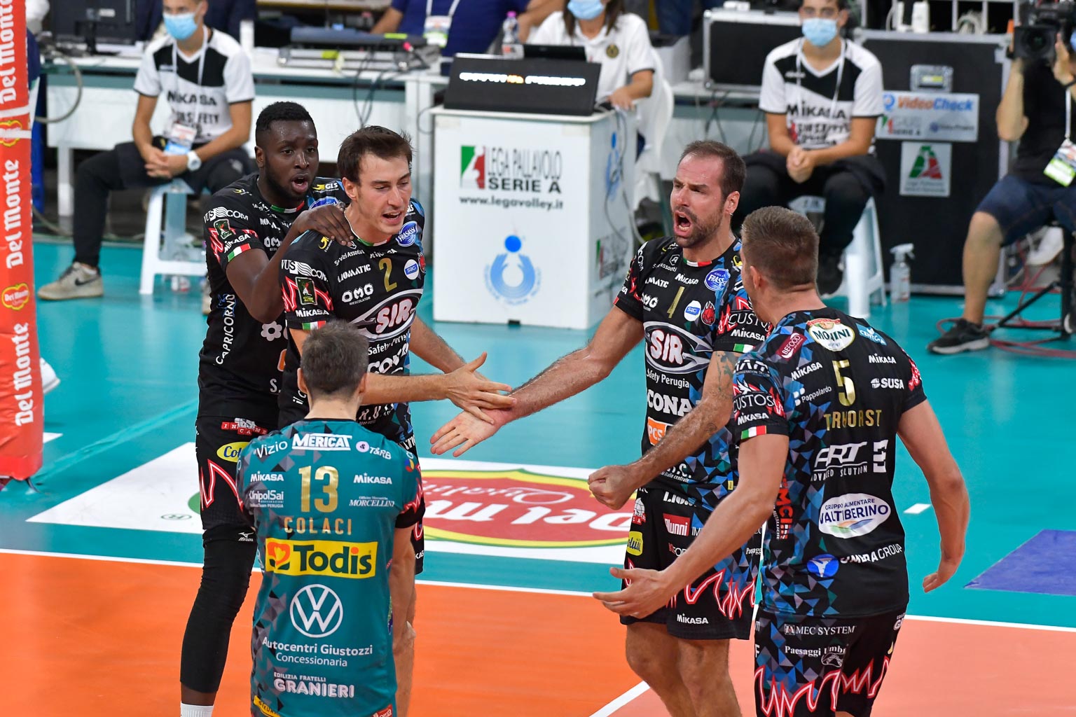 Отборът на Сър Сейфти Конад (Перуджа) взе оптималното и реализира чиста победа над Лео Шуус (Модена) с в първата полуфинална среща от Суперкупата на Италия, която се игра в “Pala Barton” пред 620 фенове.