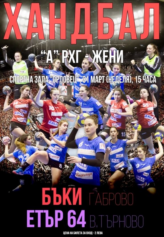 Отборите на Бъки (Габрово) и Етър 64 (Велико Търново) ще се срещнат на следващия ден (31 март) в зала " Орловец " в пряк конфликт за първото място в крайното класиране преди финалната плейофна фаза на шампионата в " А " Републиканска хандбална група при дамите. Срещата ще стартира в 15,00 часа и ще бъде ръководена от реферите Йонко Вутов (Плевен) и Галин Караджов (Горна Оряховица).