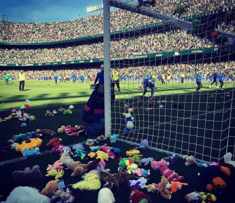 La afición del Real Betis realiza un lluvia solidaria de miles de peluches sobre el césped del Benito Villamarín. Gesto precioso. (Vía @Betis_Timejust). pic.twitter.com/oUGbf16WYL