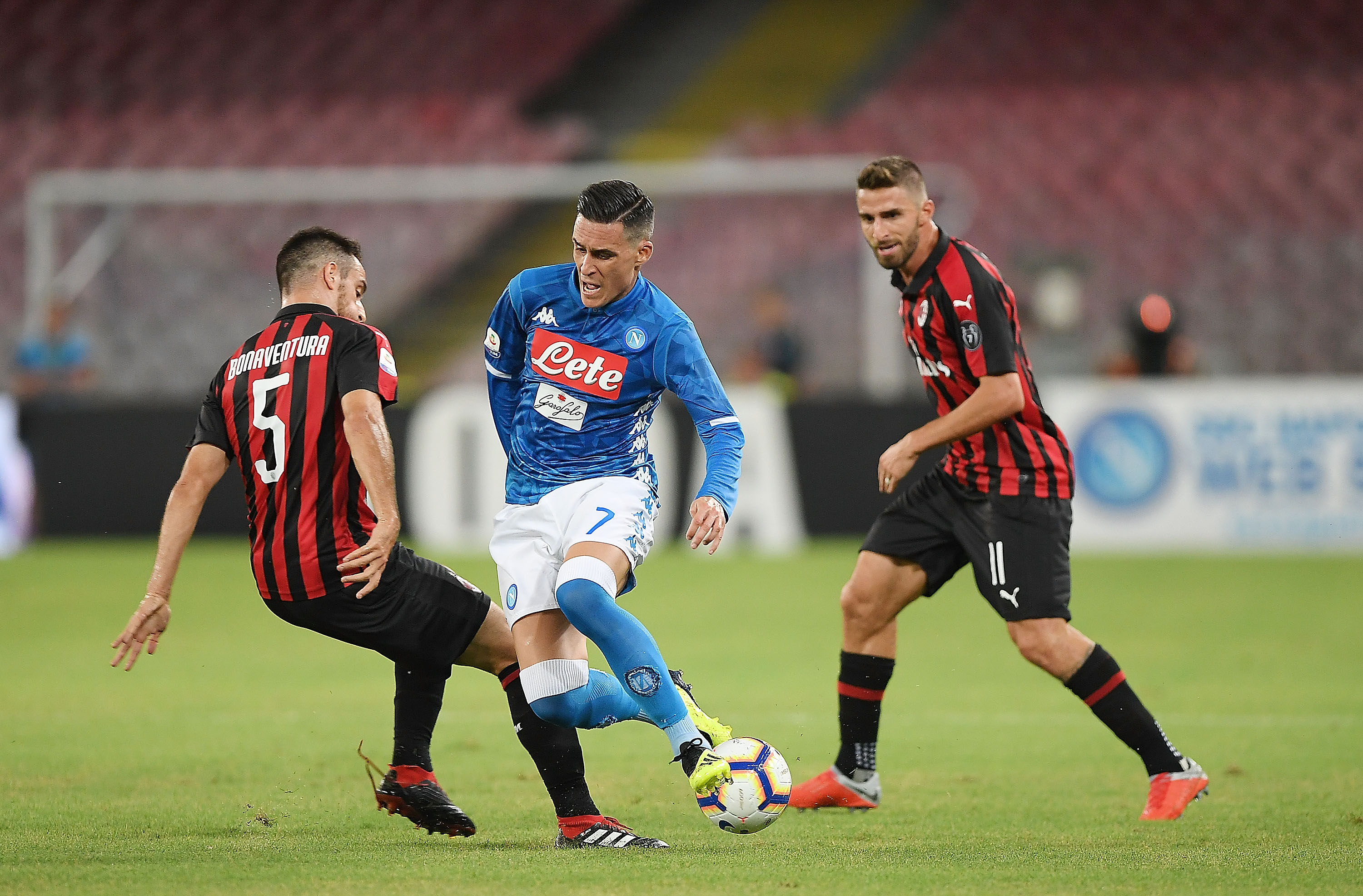 Отборите на Наполи и Милан играят при резултат 3:2 в срещата между тях на " Сан Паоло " от 2-ия кръг в Серия " А ". Гостите поведоха с гол на Джакомо Бонавентура в 15-ата минута. В 49-ата минута Давиде Калабрия удвои. В 53-ата минута Пьотър Зелински понижи изоставането на домакините, а още веднъж той в 67-ата минута изравни резултата. Резервата Дрис Мертенс пък донесе цялостен поврат за Наполи в 80-ата минута.