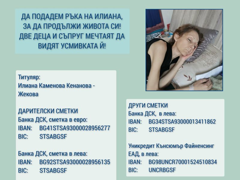 Илияна страда от рак на матката и Неходжкинов лимфом. Лекарите в Турция дават вяра животът на дамата да бъде избавен, само че времето е доста скъпо.