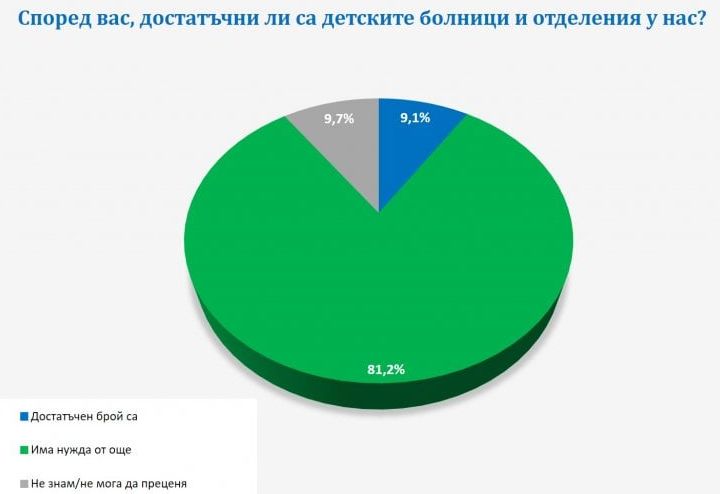 Отчетливо болшинство от българските жители (81,2%) смятат, че детските лечебни заведения, клиники и отделения са незадоволителни, без значение дали те са част от многопрофилни лечебни заведения или независими лечебни заведение. А измежду родителите с деца този % е още по-висок. Това демонстрират резултати от личен сондаж на „ Галъп интернешънъл болкан “, извършен в последните дни по отношение на нашумелия в обществото ни спор за опазването на здравето.