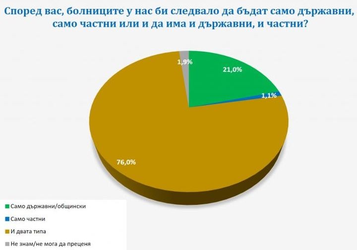 Независимо от всеобщото желание за прегледи и лекуване в частни болнични заведения, голямото болшинство от пълнолетните българи се афишира за опазване на здравето при опазване на актуалната система за съществуване на избор сред държавна или частна болница, една пета от интервюираните са за единствено държавно опазване на здравето, като това са главно хора в мъчно материално състояние.