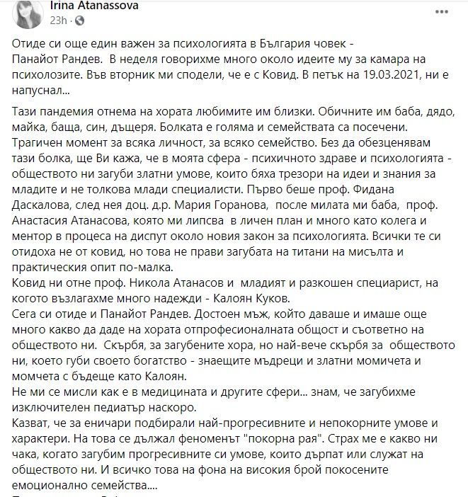 " Отиде си още един значим за логиката на психиката в България човек - Панайот Рандев. В неделя говорихме доста към концепциите му за камара на психолозите. Във вторник ми показа, че е с Ковид. В петък на 19.03.2021, ни е напуснал... ". Това заяви на персоналната си Facebook страница психотерапевтът Ирина Атанасова.
