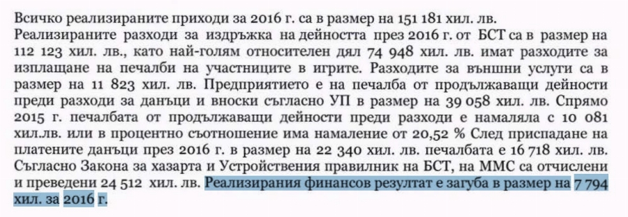 Печалбата преди налози е 39 млн. лева (по-малка с 10 млн. лева от миналата 2015-та). След приспадане на налозите облагата е 16,7 млн. лв., само че откакто Тотото прави отчисленията към Министерството на младежта и спорта (24,5 млн. лева.) отива на загуба от 7,8 млн. лева