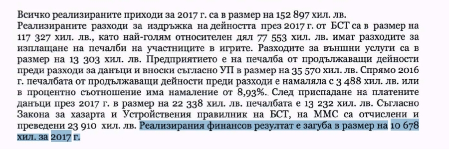 През 2017 година картината е сходна: доходи над 152,8 млн. лева, разноски от 117,3 млн. лв.. Печалбата преди облагане с налози е 25,5 млн. лева, само че след заплащането им е 13,2 млн. лв.. Отчисленията тогава за спортното министерство са на стойност 23,9 млн. лв., след което се образува загуба от 10,7 млн. лева