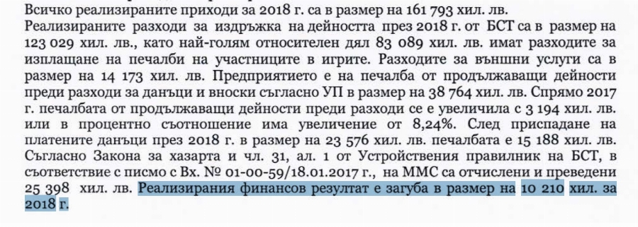 Проверка на Actualno.com сочи, че казаното от него е съвсем изцяло правилно. На този прекомерно ранен стадий не може да се ревизира писмено по какъв начин е завършила последната финансова година за Спортния тотализатор (БСТ). Но държавното тото е на загуба в интервала от 2014-та до 2019-та година в това число.