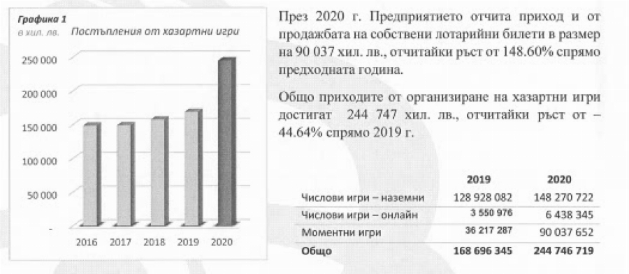 Приходи единствено от числовите игри са 154,7 млн. лева, а от лични лотарийни билети - 90 млн. лева (ръст от 148%). Приходите от оперативна активност се усилват с 43,4% или - със 76,2 млн. лв., достигайки до 251,8 млн. лева Приходите от моментни лотарийни игри бележат растеж от 148,6%, а постъпленията от числовите игри нарастват с 16,8%. Изплатените облаги са за повече от 128 млн. лева