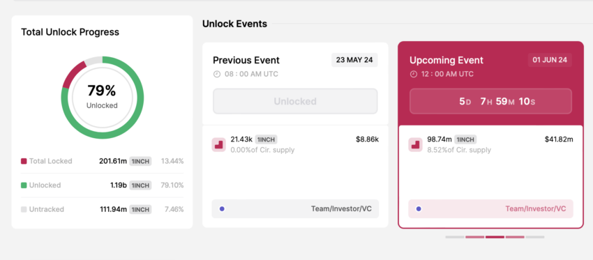 Следващото отключване на токена 1INCH е планувано за 1 юни, като близо 100 милиона токена ще бъдат пуснати в послание, разпределени сред разработчици, ранни вложители и фондове за рисков капитал.