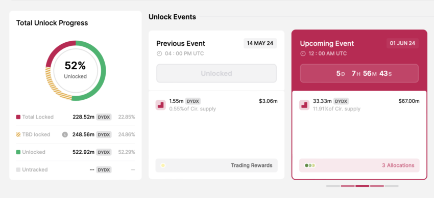 В началото на 2023 година dYdX , най-големият децентрализиран протокол за търговия с безсрочни фючърси, преразгледа първичната си токеномика. Според актуализацията 27.7% от общото предложение на dYdX ще отидат при ранните вложители, 26.1% – в хазната, 15.3% – в екипа и 7% – при бъдещите чиновници и консултанти на dYdX. По-голямата част от dYDX токените, отключени на 1 юни, ще бъдат разпределени сред вложителите и екипа на плана, а останалите ще бъдат непокътнати за бъдещите чиновници.