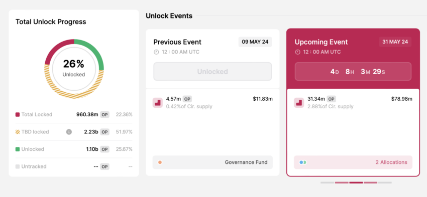 На 31 май планът ще пусне в послание над 30 милиона OP токена. Според TokenUnlocks те ще бъдат разпределени сред вложителите и главните сътрудници.