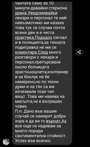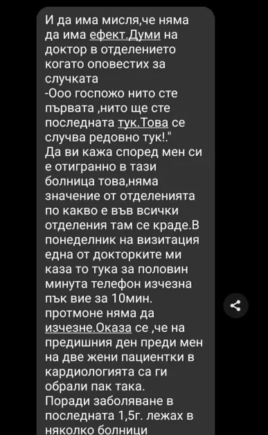 Тя изпрати и чатове с част от хората, с които си е писала по същия мотив. Една от кореспонденциите сочи, че при друга кражба от същата болница лекарите и личния състав са споделили, че това „ тук се случва съвсем всеки ден и е чиста процедура “. Те са споделили още, че и на тях са им изчезвали движимости. Имало е случай, в който е бил откраднат и телефон в границите на половин минута.