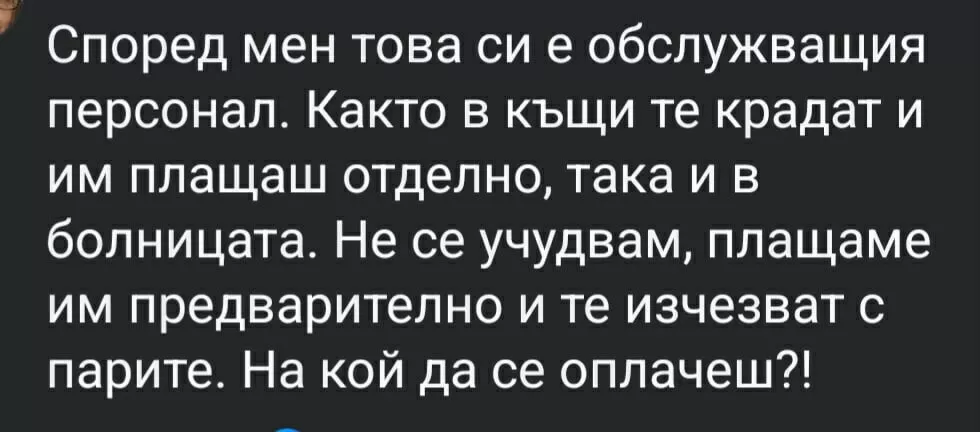 „ Поради заболяване лежат в няколко държавни и частни лечебни заведения, като такова нещо нямаше и във всяка една достъпът е стеснен и куп други работи “, споделя въпросната друга пострадала.