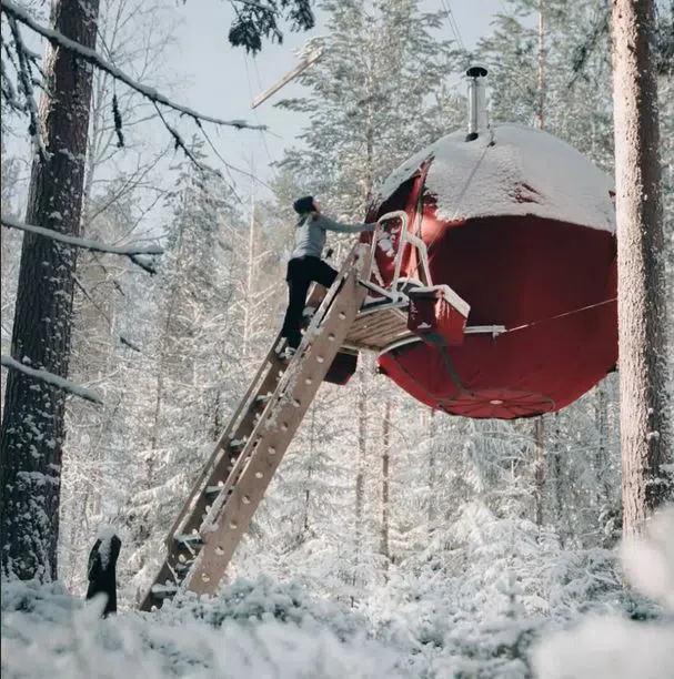 Това е гигантска алена топка, закачена на борове в тогавашна плантация в Швеция. Прилича на коледна декорация, само че не е. Може да бъде разказана като „ палатка за дърво “, направена от алуминий и шперплат и покрита с водоустойчиво платно.