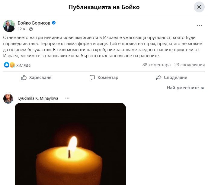 „ В тези моменти на тъга, ние заставаме дружно с нашите другари от Израел, молим се за починалите и за бързото възобновяване на ранените “, приключи Борисов.