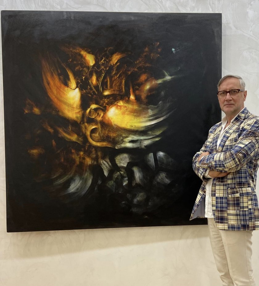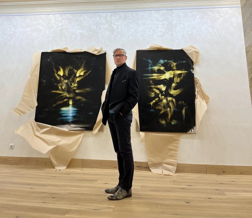 Художникът по време на откриването на своята изложба-живопис " Анатомия на енигмата " в Музей-галерия " Анел " в София в края на май 2023 година