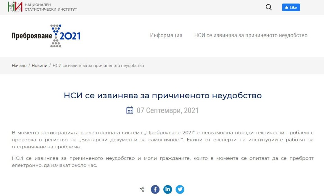 „ В момента в Информационна система Преброяване 2021 не може да се прави регистрация, заради механически проблем с инспекция в регистъра на „ Български документи за идентичност “.