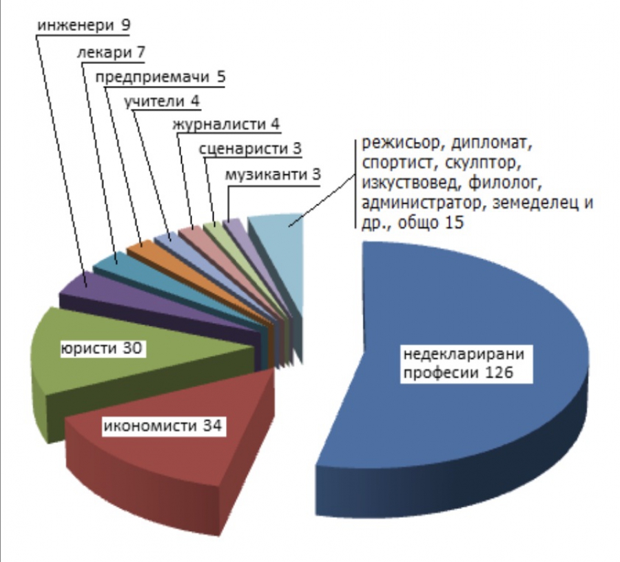 В този ред на мисли си направих труда, стъпвайки на и разгледах в елементи листата – човек по човек с нашите избраници от най-краткосрочния, употребявал единствено 13 работни дни, парламент в новата ни история. Интересувах се не толкоз от тяхното обучение, колкото от специалностите им. Впрочем след датата и родното им място е посочена (по-добре е да кажа би трябвало да бъде посочена) тяхната професионална реализация в живота им. Резултатът от това мое изследване е онагледен благодарение на диаграмата по-долу.