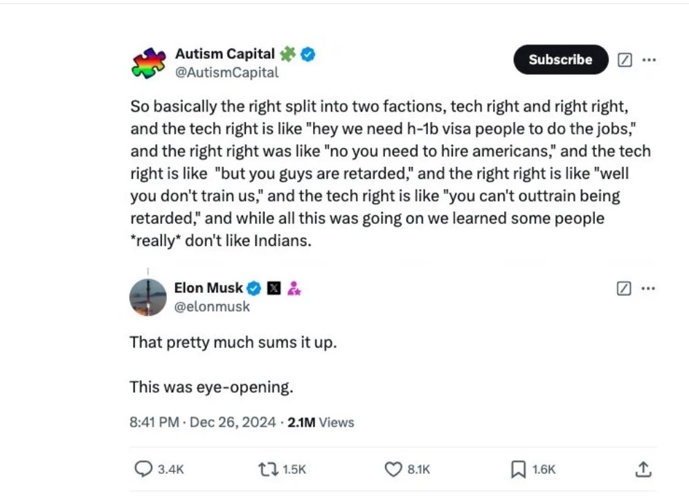 Одобряването от Мъск на тази обява, която се базира на поддръжката за визи H-1B (неимигрантска виза, предопределена за задгранични служащи, които желаят да работят в Съединени американски щати в професионални специалности, изискващи профилирани знания), провокира реакция от страна на десните националисти, в това число Лора Лумер и Оуен Шройер, които се опълчват на имиграцията.