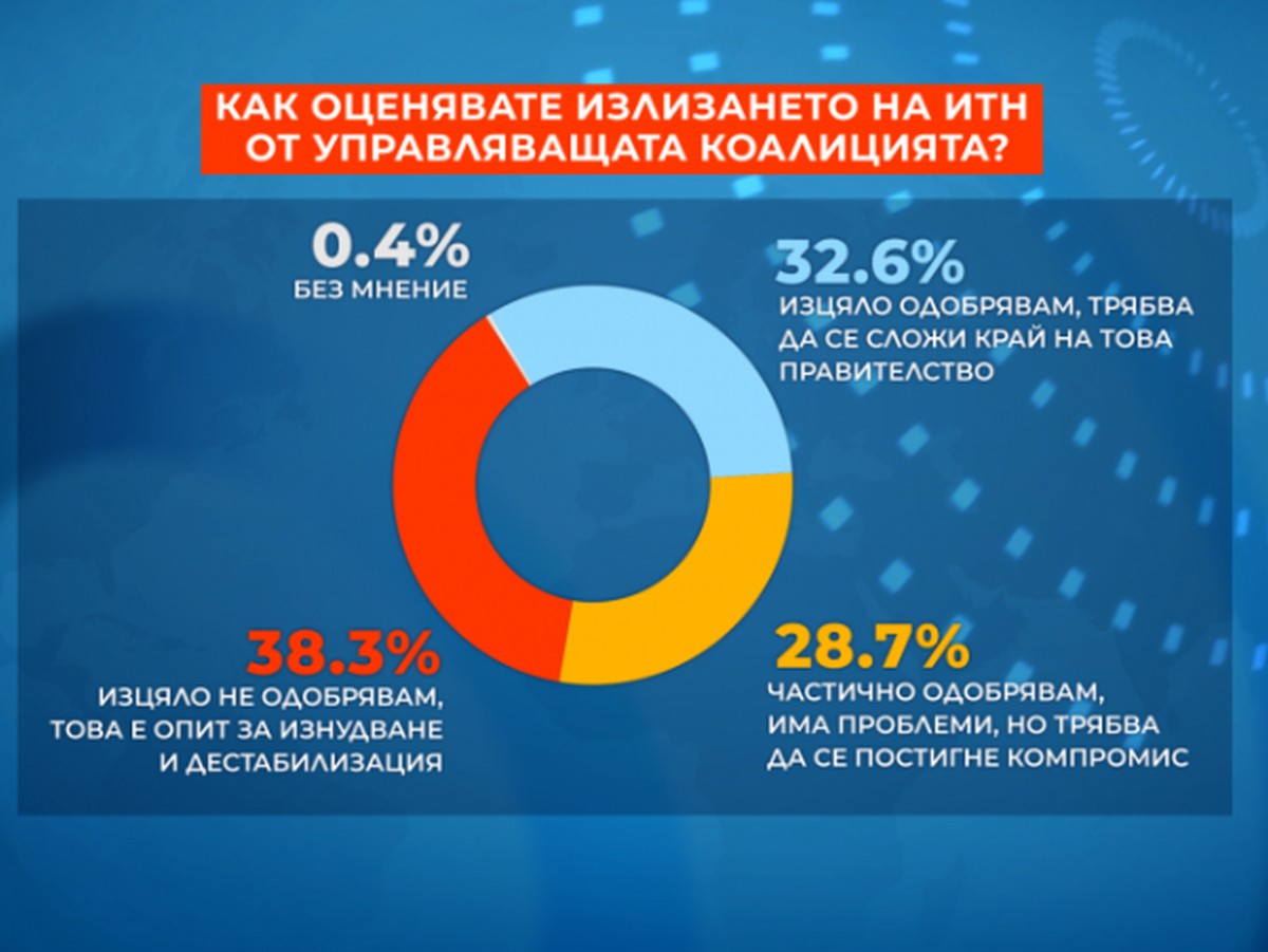Проучването демонстрира, че 33% изцяло го утвърждават, 29 на 100 считат, че проблеми има, само че би трябвало да се търси компромис за продължение живота на кабинета. 38% са напълно против непредвидения ход, намират го за изнудване и опит за дестабилизация.