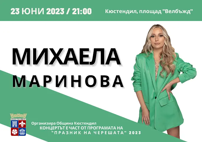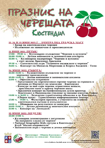В петък вечер на 23 юни 2023 година " Празникът на черешата " в Кюстендил стартира с Кулинарноизложение, надяждане с череши, детска анимация и концертна стратегия, с присъединяване на Михаела Маринова и ТИНО. Десетки кулинари ще показват своите ястия и специалитети в конкуренцията " Череши в кухнята ", чиито посетител водещ ще бъде Драгомир Драганов.