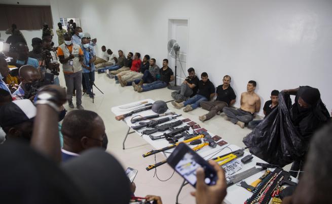 На излъчена по малкия екран конференция късно нощес началникът на полицията Леон Шарл заяви, че са задържани и сподели двама американци от хаитянски генезис и 15 от колумбийците. Показани бяха също голям брой колумбийски паспорти, автомати, мачете, радиостанции и принадлежности, в това число чукове и клещи за рязане на болтове.