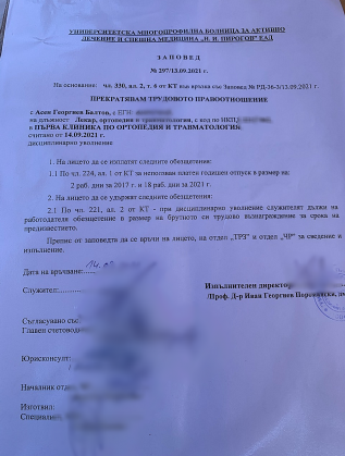 П роф. Асен Балтов е уволнен от „ Пирогов” дисциплинарно и дължи наказателна клауза на лечебното заведение. Това е записано в заповедта за освобождението му, която самият Балтов даде на.