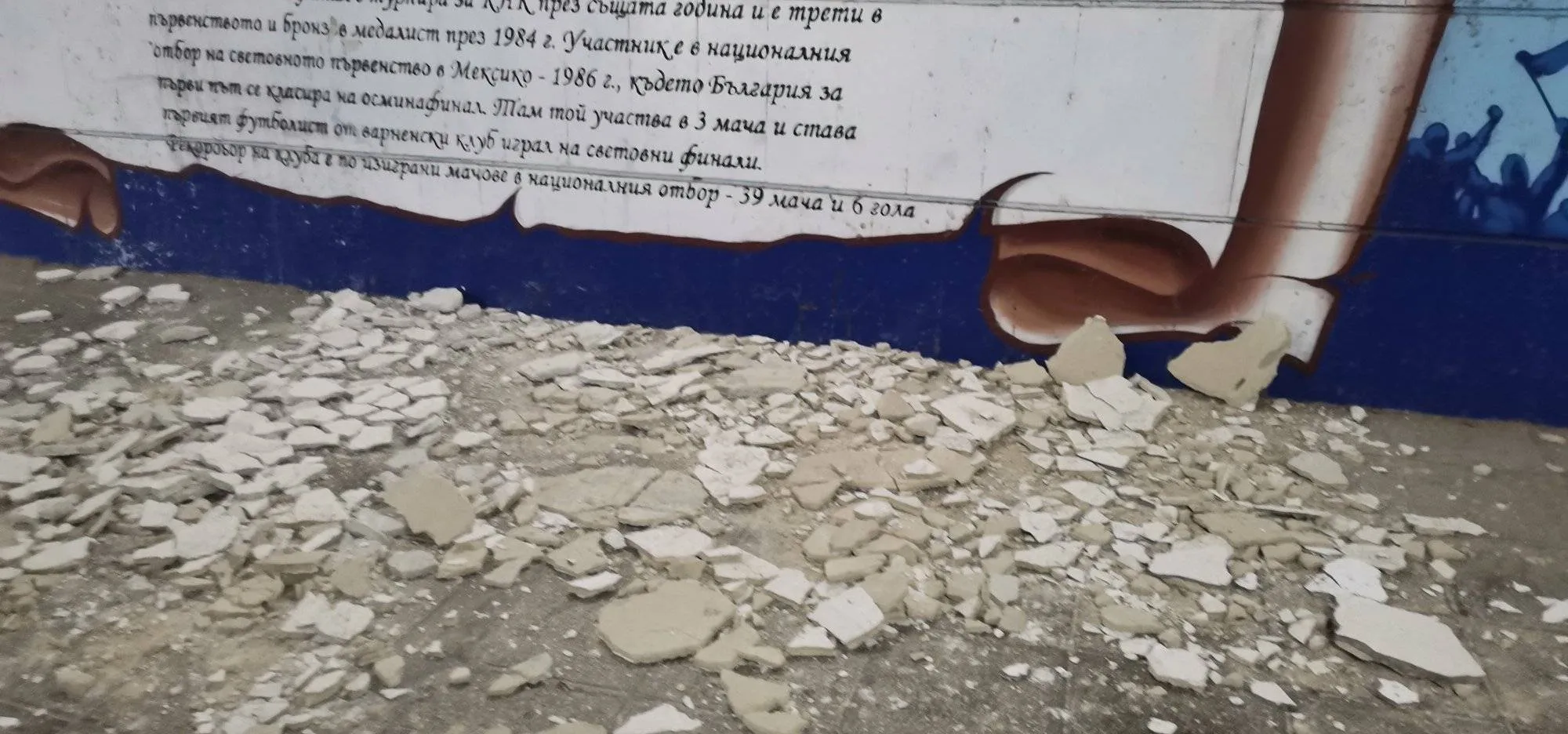 На оповестените фотоси се вижда разпиляна мазилка по земята, както и ясно отлепени и напукани сектори по тавана, което слага под подозрение сигурността на пешеходците, преминаващи всекидневно оттова. Към момента няма данни за потърпевши, само че варненци упорстват за незабавна реакция от страна на общинските управляващи.