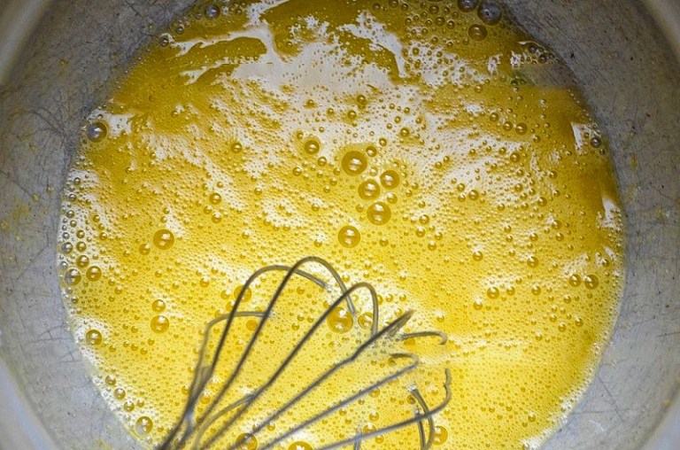 Разбийте яйцата до гладкост, прибавете 500 мл вода, сол, захар, сода за самун и разбийте още веднъж.