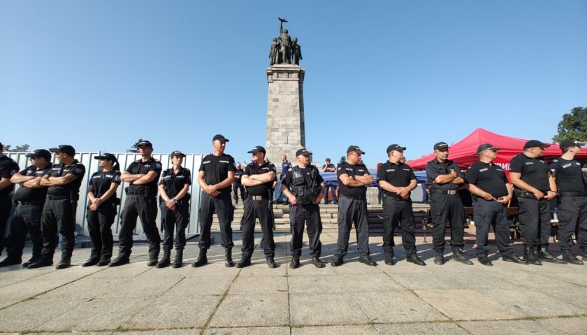Плътен полицейски кордон и тежко въоръжени служители на реда изпратиха нощта пред Паметника на Съветската войска, и по същия метод посрещнаха утрото пред монумента. Поводът тази заран - слагане на предпазна ограда към оборудването, позволение, за което има публично от три дни.