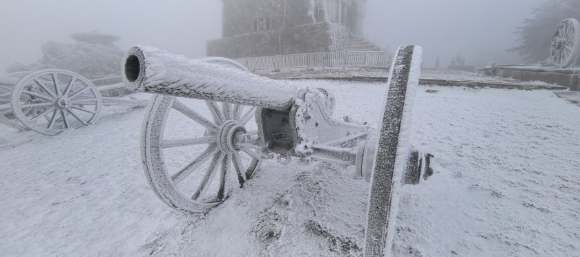 Паметникът на свободата на връх Шипка осъмна в бяла одеждa. Тази нощ там падна първият сняг за сезона.
