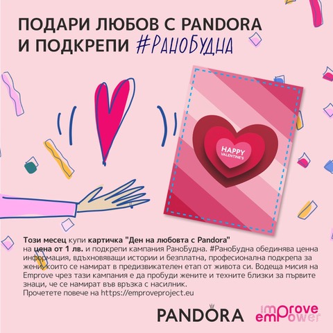 Pandora и Emprove сплотяват сили в поддръжка на дами, които са преживeли домашно принуждение. Кампанията „ Подари обич с Pandora и поддържа “ започва на 25.01., а средствата от нея ще бъдат дарени напълно за идеята #РаноБудна!