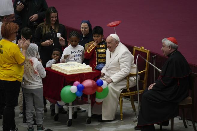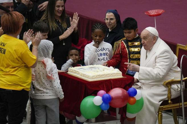 Папа Франциск навърши през днешния ден 87 години, посрещнат от деца, които му помогнаха да духне свещичката на празнична бяла торта, съобщи Ройтерс. Децата от ръководената от Ватикана педиатрична клиника изпяха няколко песни пред Светия отец и му подариха букет слънчогледи.