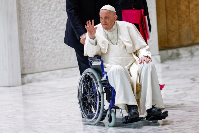 Папа Франциск за първи път се появи на обществено място в инвалидна количка, откакто болежка в коляното го ограничи да върви независимо, написа Ройтерс.