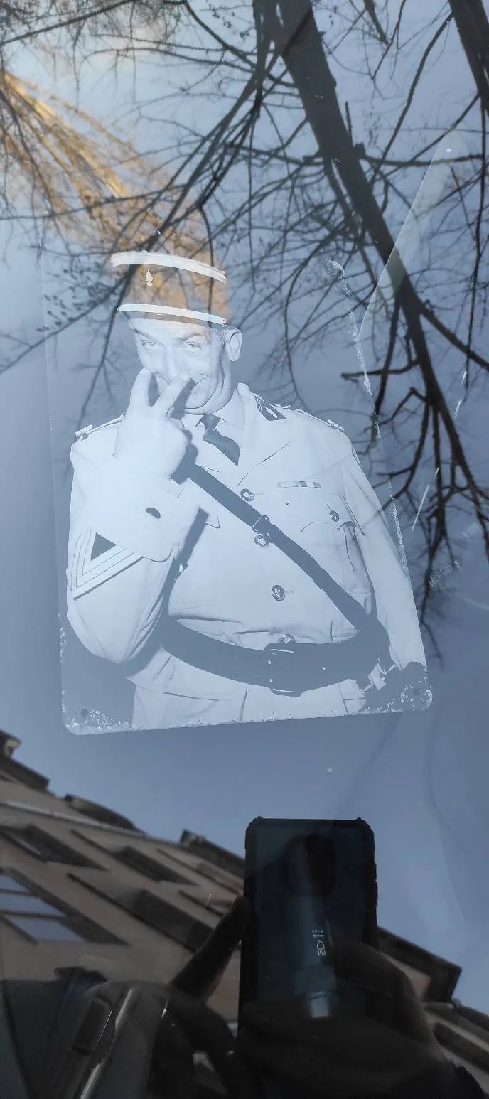 На таблото под предното стъкло на автомобила той е сложил огромна фотография на именития френски артист Луи дьо Финес, в добре позната роля на непоколебим служител на реда в " Полицаят от Сен Тропе ". Погледът от фрагмента е задоволително сладкодумен – като че ли автомобилът е под непрекъснато наблюдаване.