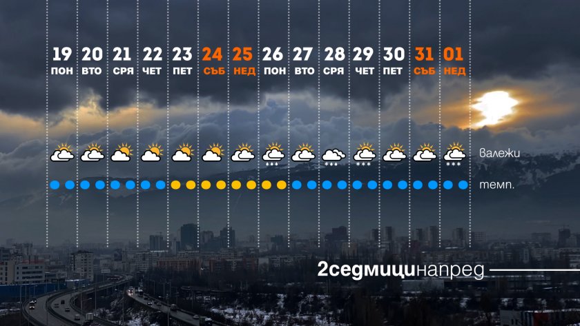 Студът ще се задържи доникъде на седмицата с температури заран до минус 5 - минус 6 градуса, следобяд – до 5-6 над нулата. След това, до Коледа термометрите ще вървят нагоре. Навръх Рождество Христово се чакат стойности сред 10 и 15 градуса.
