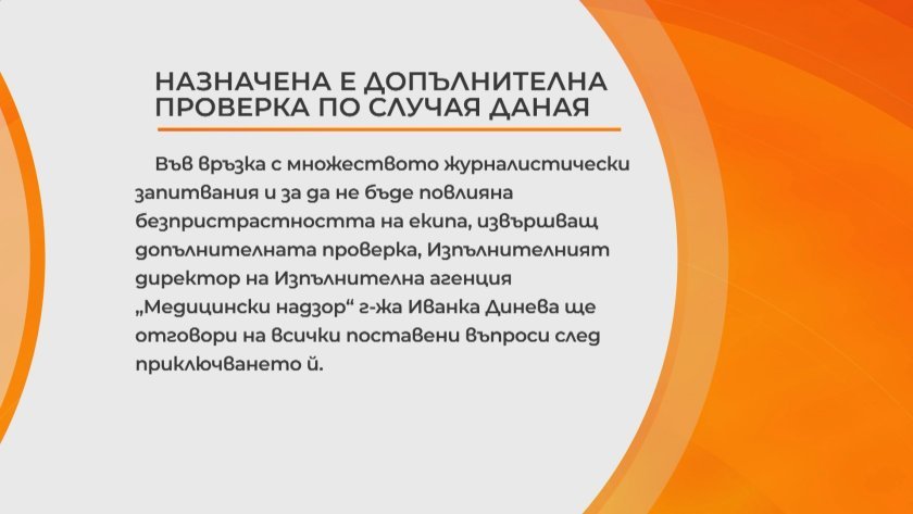 Първата инспекция на Медицински контрол не даде отговор на въпроса дали Даная можеше да бъде избавена. Майката на умрялото момиче Ани Стоянова е сюрпризирана от обстоятелството, че " те излязоха от там и хвърлиха обвинявания против мен ".