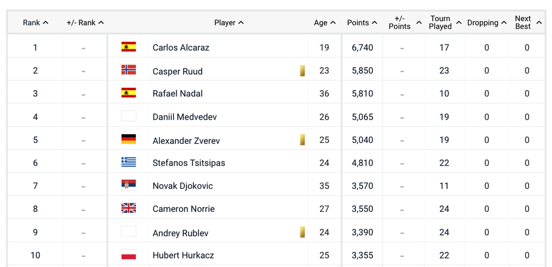 В топ 10 няма промени. №1 е новият първенец на Откритото състезание на Съединени американски щати Карлос Алкарас (Испания) с 6740 точки. Втори с 5850 точки е финалистът в Ню Йорк Каспер Рууд (Норвегия), а трети остава Рафаел Надал (Испания) с 5810 точки. Руснакът Данаил Медведев, който не съумя да отбрани купата си на " Флашинг Медоус ", е четвърти с 5065 точки. Следват Александър Зверев с 5040, Стефанос Циципас с 4810, Новак Джокович с 3570, Камерън Нори с 3550, Андрей Рубльов с 3390 и Хуберт Хуркач с 3355 точки.