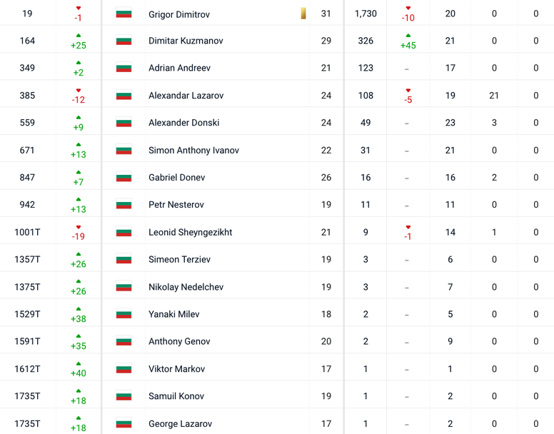 Добри са новините и за Адриан Андреев, който бележи напредък с две места до №349 със 123 точки. Александър Лазаров обаче пада с 12 позиции и към този момент е №385 с актив от 108 точки.