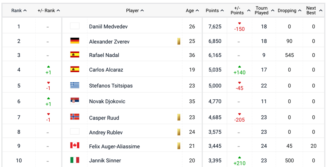 Промени има и в Топ 10. Тройката се резервира в състав Даниил Медведев, Александър Зверев и Рафаел Надал, само че четвърти към този момент е 19-годишният Карлос Алкарас, който измести Стефанос Циципас и записа нов връх в кариерата си. Шампионът от “Уимбълдън ” Новак Джокович пък изпревари Каспър Рууд и към този момент е №6. Осми е Андрей Рубльов, следван от Феликс Оже-Алиасим и Яник Синер.