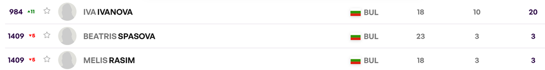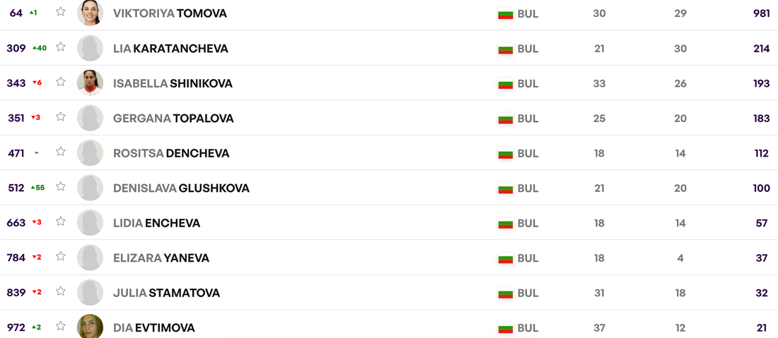 Втора ракета на България все още е Лия Каратанчева, която напредна с 40 места до 309-ото с 214 точки. Изабелла Шиникова е №343 съд 193 точки, а 351-ва позиция заема Гергана Топалова със 183 точки.